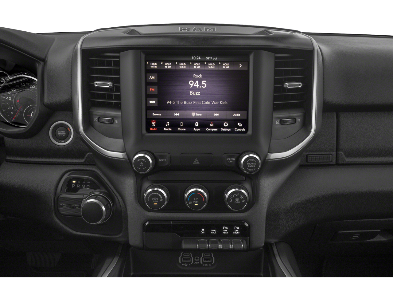 115V Auxiliary Power Outlet, 115V Auxiliary Rear Power Outlet, 2 USB Full Function/Charge Only Media Hub, 3.21 Rear Axle Ratio, 400W Inverter, 8.4 Touchscreen Display, Air Conditioning ATC w/Dual Zone Control, Alloy wheels, Apple CarPlay, Auto-Dimming Rear-View Mirror, Big Horn IP Badge, Big Horn Level 2 Equipment Group, Brake assist, Bucket Seats, Class IV Receiver Hitch, Cluster 7.0 TFT Color Display, Dampened Tailgate, Electronic Stability Control, Foam Bottle Insert (Door Trim Panel), Glove Box Lamp, Heated Front Seats, Heated Steering Wheel, Integrated Center Stack Radio, ParkSense Front/Rear Park Assist w/Stop, ParkView Rear Back-Up Camera, Power 4-Way Driver Lumbar Adjust, Power 8-Way Driver Seat, Power Adjustable Pedals, Power Heated Fold Away Mirrors, Quick Order Package 23Z Big Horn/Lone Star, Radio: Uconnect 4 w/8.4 Display, Rear Dome w/On/Off Switch Lamp, Rear Power Sliding Window, Rear step bumper, Rear Window Defroster, Remote Start System, Security Alarm, Single Disc Remote CD Player, SiriusXM Satellite Radio, Steering Wheel Mounted Audio Controls, Sun Visors w/Illuminated Vanity Mirrors, Universal Garage Door Opener, Wheels: 18 x 8.